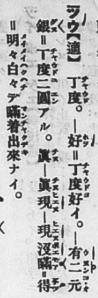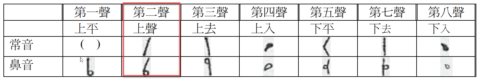 片假名兩字母右側,由左下往右上書寫的撇劃,表【台羅八聲調】之【上聲】(或稱:第 2 調)。