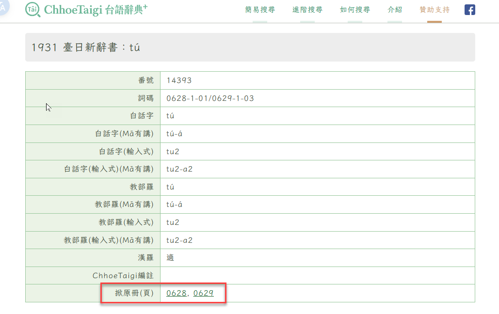 瀏覽頁號計算方式:若《 ChhoeTaigi 台語辭典+》告知漢字【適】,可在字典的第 628, 629 頁找到;瀏覽網頁時,將頁號再上 51 ,便可得到瀏覽影印本時的頁碼。: