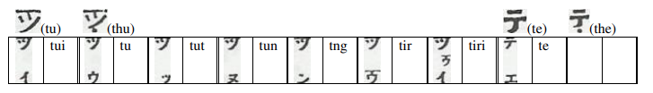 - 第一個片假名字母【ツ】上方,標示【横槓線】,表【聲母】原先發:【tu】的讀音,改發【t】音;
