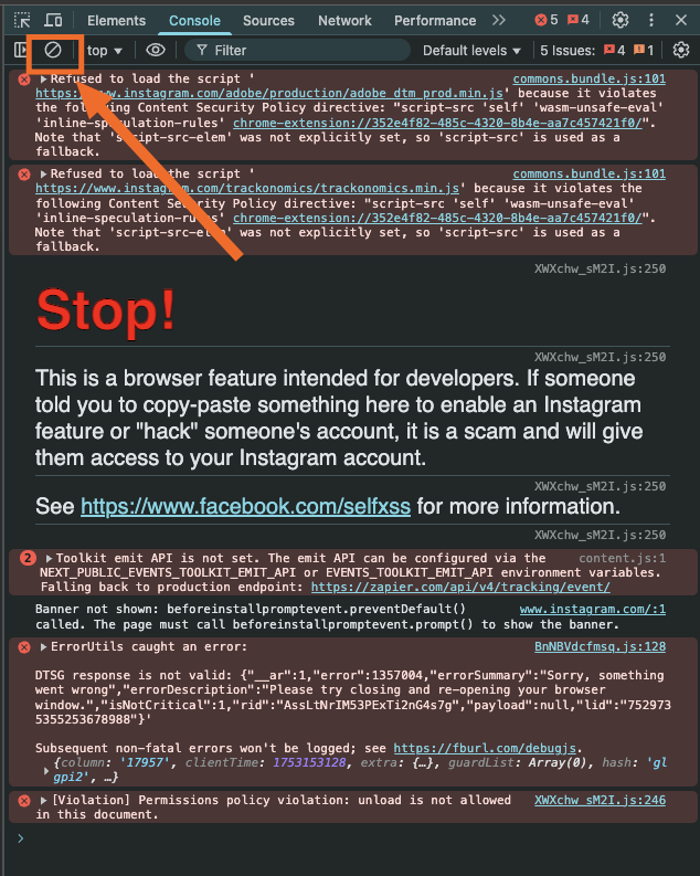 @flocked That's a warning by instagram, you can ignore that and paste the script above. Or dismiss it