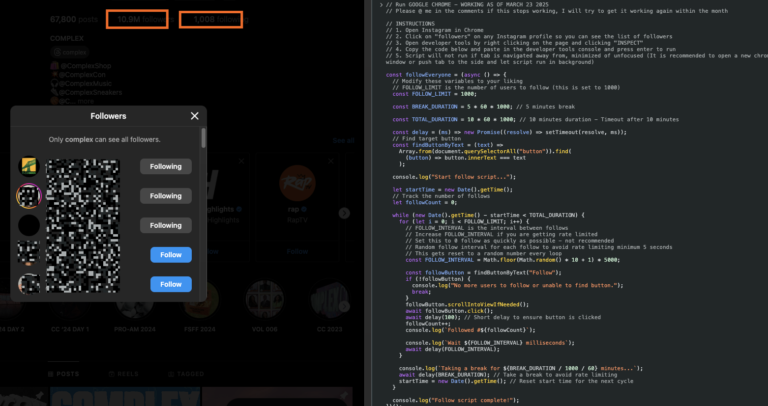 @matiaspata You need to have the "followers" or "following" pane open. Can you confirm that they are open and there's a "Follow" button on the page? Just tested it, and it appears to work fine as long as the instructions are followed correctly.