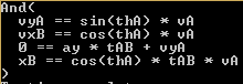 var vals = new List<Equation>() { xA == 0, yA == 0, vA == 25.0, vyB == 0, ax == 0, ay == -9.8, Pi == Math.PI };