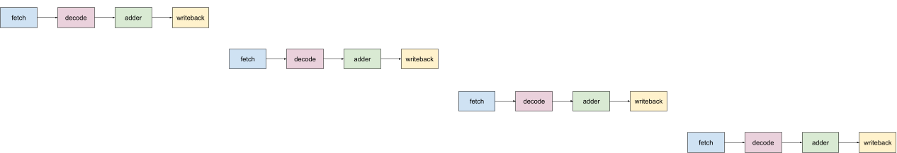 In this flow, the processor "focuses" on each instruction in turn, fully completing its execution before moving on to the next one, and requiring sixteen full cycles to evaluate four instructions. However, as mentioned earlier, the decoder (for example) doesn't really need to wait for the current instruction to complete before starting to decode the next one. In fact, all four of these instructions are entirely independent, which means that the processor can safely squish it all together and keep each hardware unit fully utilized during each stage of the evaluation: