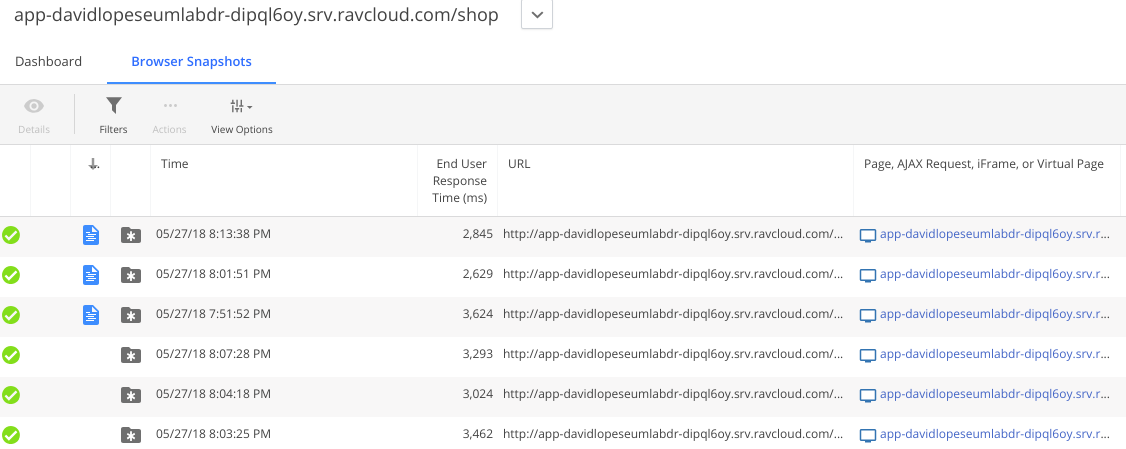 - Generate traffic and check your Browser Page snapshots, some should have a corresponding APM Snapshot
