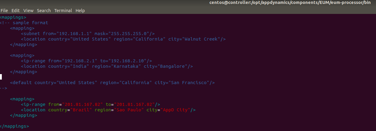 Sometimes you will need to setup custom Geo Locations for a customer. This could happen because of many reasons, maybe they have a wide range of users coming from internal IP addresses, or maybe some internet IP addresses are not mapped to locations. In this lab we will practice on how to create custom geo locations by editing the geo-ip-mappings.xml file that comes bundled with the EUM Server.