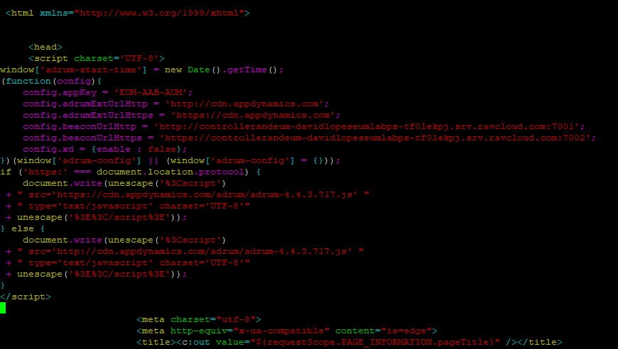 - The snippet is already there and commented, but we need to update it with our EUM Server hostname and App Key