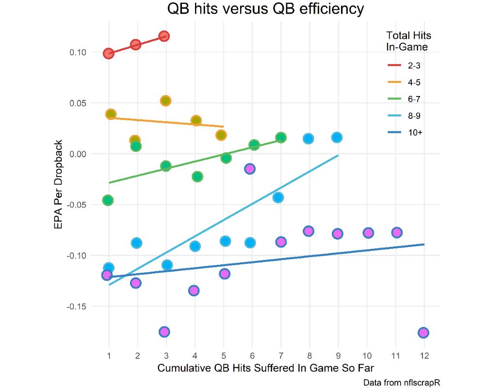 Side note: I'm not showing 0 hits because there's a mechanical relationship between QB hits and efficiency. It is the one x-axis point that contains 0 hits, by definition, so of course EPA per play is higher: it's a comparison of a set of plays with no QB hits to other sets of plays with QB hits. I also truncated the x-axis at 12 hits because anything higher is extremely rare.
