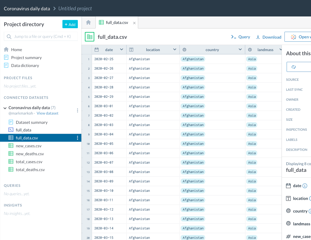 Every file and query on data.world is an API endpoint to be consumed via any language or application. Here are a few common examples: