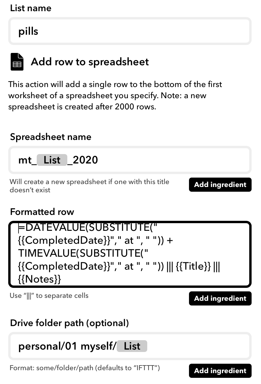 Example. Sending data from iOS Reminders to Google Sheet. {{CompletedDate}} value is replaced by any other.