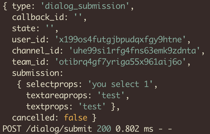 위의 이미지에서 submission 에 나와있는 값이 dialog를 통해 받은 값이다. 보면 값의 이름이 위에서 설정했던 textprops, textareaprops 그리고 selectprops 인것을 확인할 수 있다. selectprops 의 값도 코드의 projects 에서 설정했던 value 중 하나이다. 이제 이 값과 나와있는 다른 id 들을 이용해서 다시 API를 호출해도 되고 Gitlab이나 Github와 같은 외부 서비스로 특정 동작을 요청할 수도 있다.
