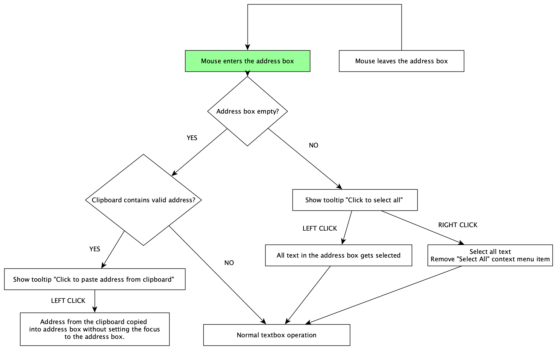 When the mouse cursor enters the address box area, clipboard address validation is performed. If the check is successful, the appearance of the mouse cursor remains unchanged, unlike the normal text box behavior when it changes to the caret. Optionally a special cursor icon can be used, however, in order to avoid cross platform issues, the implementor may choose to go with the default mouse cursor as suggested.