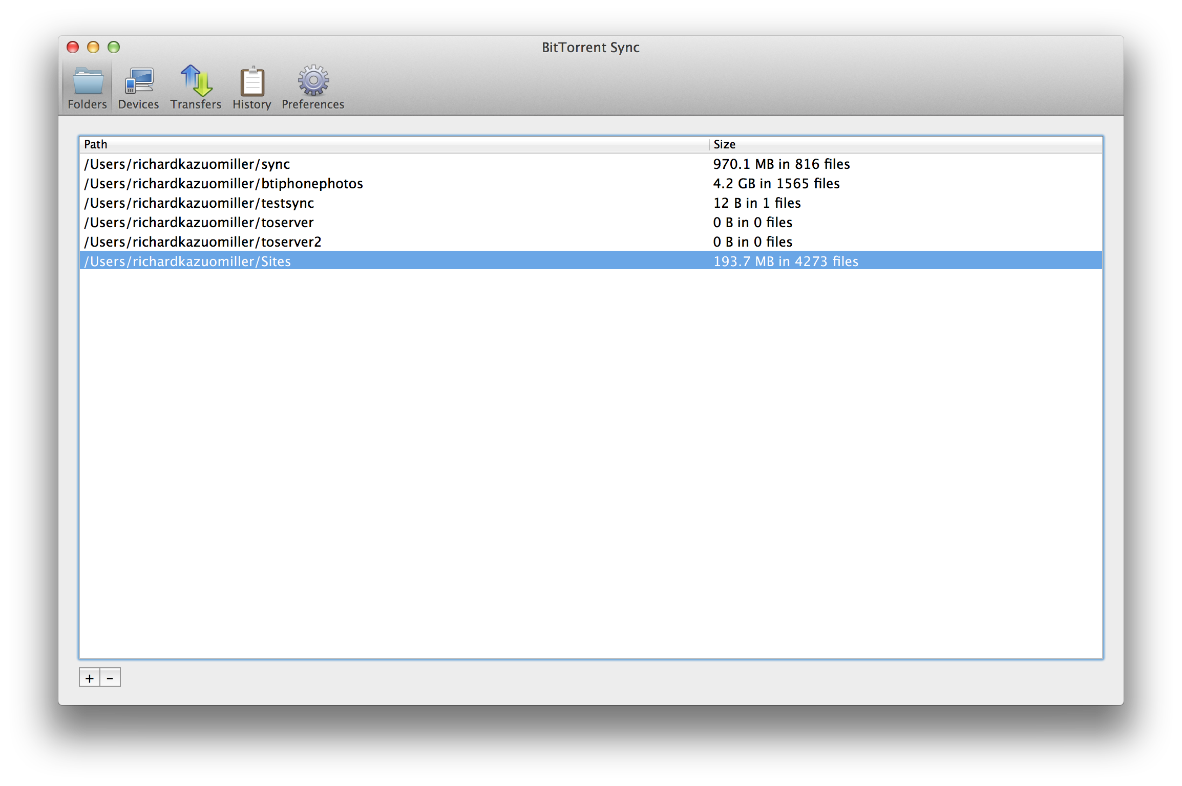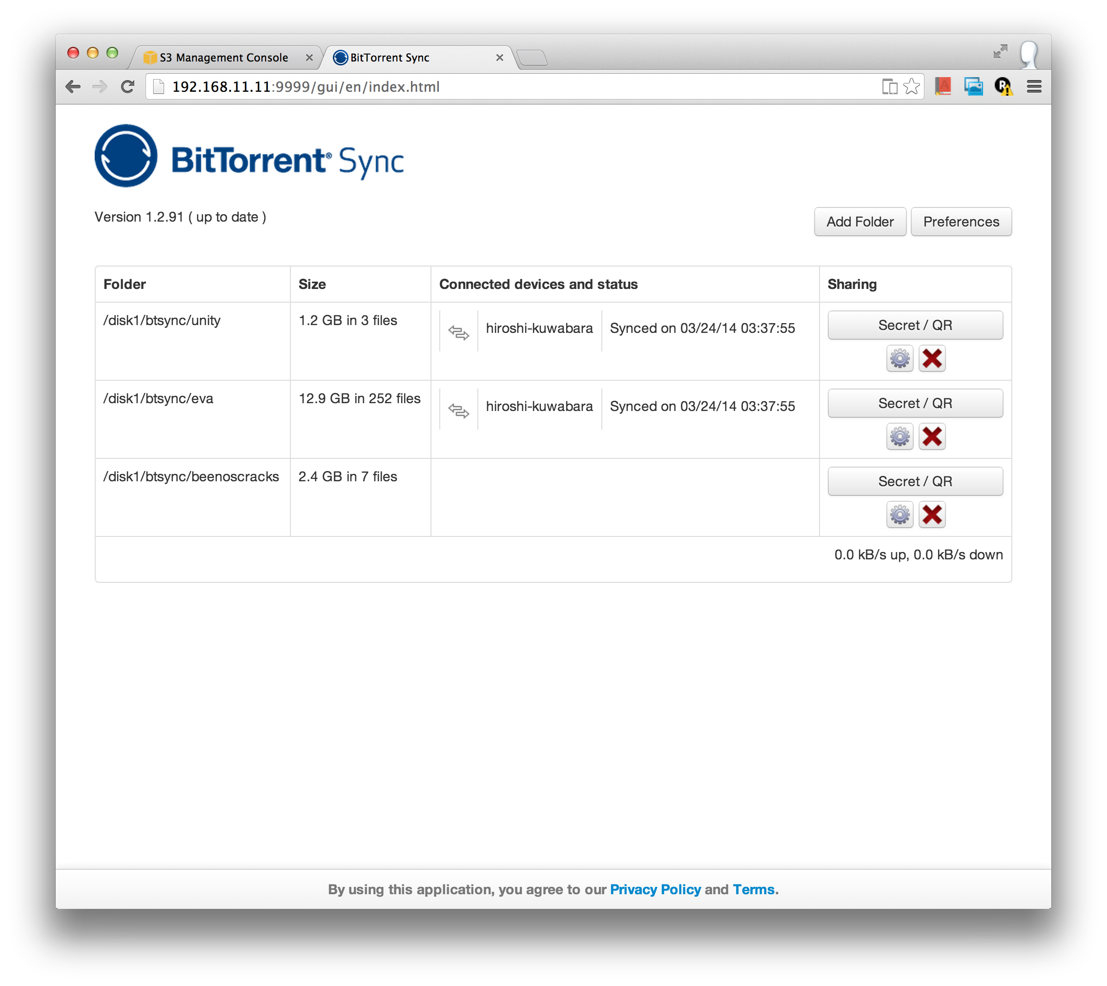 Bittorrent Syncを使ってるマシン全てにインストールして、プロジェクトが入っているフォルダを追加して、secretをそれぞれにの端末に入れると、勝手にそのフォルダに入ってるファイルが全て同期される。Dropboxみたいな仕組みだけど、データは自分のマシンにしか保存されないのでストレージの制限とかはない。それに、エンジニアだとnode_modulesとか.gitの中身の小さいファイルが結構貯まるからDropboxみたいなサービスで同期するのは非現実的なソリューション。しかし、BitTorrent Syncにフォルダを追加すると、.SyncIgnoreというファイルを作ってくれてそいつに同期したくないファイルを書けばBTSyncのデーモンは無視してくれる。