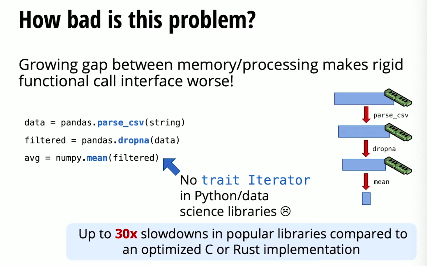 演講一開始就點出創造 Weld 的目標(絕對不是找不到論文題目):當前資料分析工具的的最佳化多半針對個別函式(per function basis),不同功能的函式往往自成一個函式庫,這種現象雖然有利於更多貢獻者加入,但是不同函式、不同函式庫間的最佳化非常匱乏。小弟我擅自將這種現象稱為「Optimization Fragmentation 」(自作聰明)。