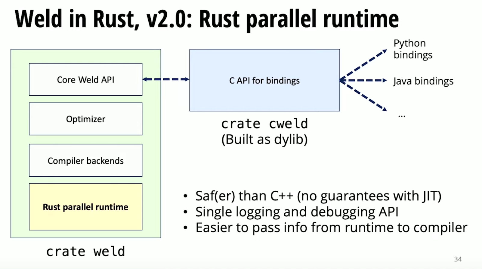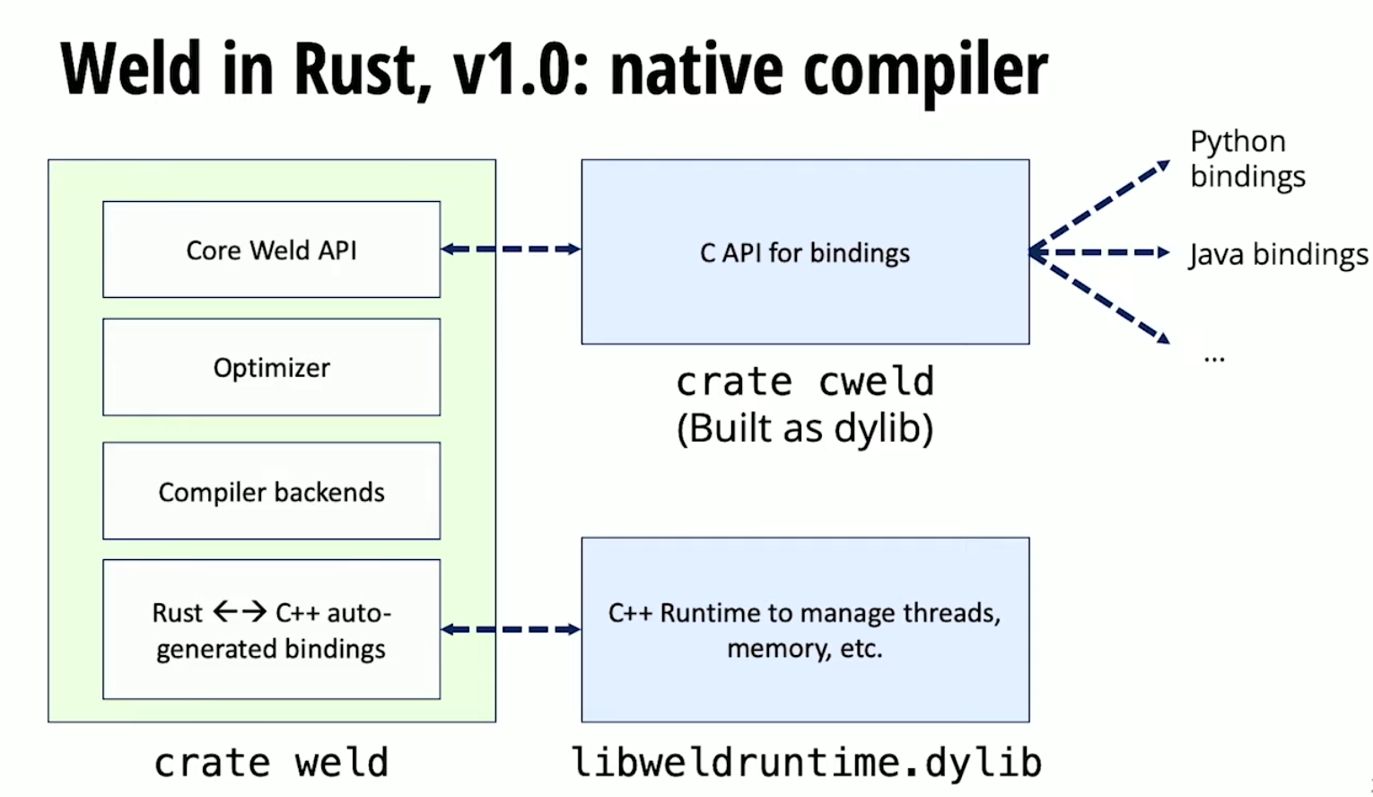 1.0 版已經用 Rust 重寫 compiler ,但 Runtime 還是 C++ runtime,C API binding 也還是用 C 寫,所以整個 Weld 在 1.0 其實是 C/C++/Rust 混雜的專案。