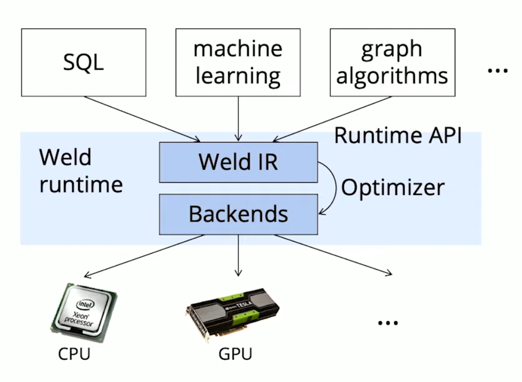 - Weld Runtime 由以下幾個組件組成: Weld Runtime = Weld IR (+ optimizer) + backends。